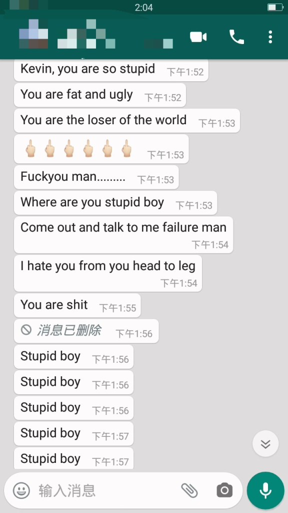 This type of online bullying constitutes of posting about or directly sending insults and profanity to their target. This also is a normal types of the cyberbullying. My friends has attact by this type of the cyberbullying, for example, they will use some bad word to make the people feel uncomfortable such as the picture(Picture1.0) showing that. For example, they will criticism your appearance such as fat, ugly, ‘your body is short’, ‘why you look like a pig’ and something like that. This situation caused my friend to feel very inferior and sad. Therefore, he like to stay alone, this make him almost suffer from autistic. I very hate Cyberbullying because it make me lose my friends, before that he is person very friendly and outgoing personality.